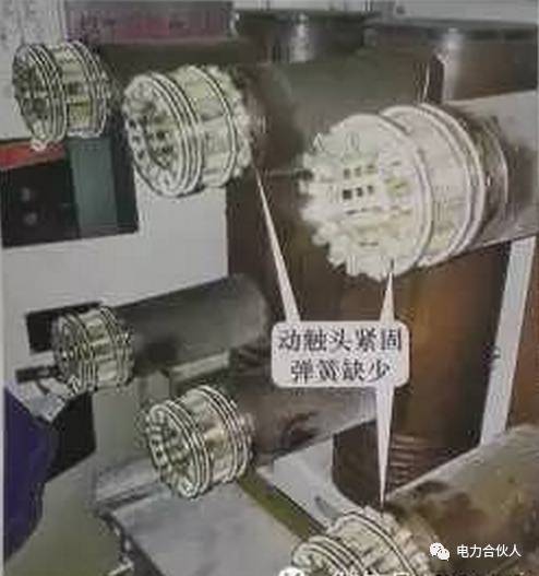 經(jīng)專業(yè)人員檢查,確定母線室和后下柜無發(fā)熱開關(guān)柜,手車甲、乙相母線側(cè)動、靜觸頭和甲相下動、靜觸頭的觸頭部分發(fā)熱。開關(guān)柜電源故障檢查:將手車拉出機柜。發(fā)現(xiàn)一個壓縮彈簧在手車的a相母線側(cè)(上部)上的移動觸點的端部缺失,并且一個壓縮彈簧在手車的a相母線側(cè)上的下移動觸點的導(dǎo)電桿和b相母線側(cè)上的移動觸點的絕緣外殼側(cè)缺失(見圖17)。當(dāng)檢查手車的靜態(tài)接觸情況時,發(fā)現(xiàn)下落的壓縮彈簧留在相應(yīng)的靜態(tài)接觸盒中(見圖18)。