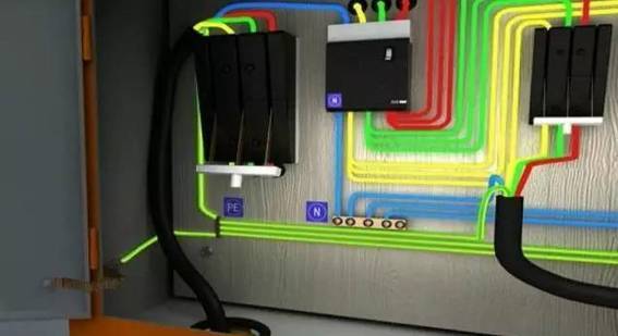 6.黃色、綠色和紅色三相線分別從除法配電箱的分路隔離開(kāi)關(guān)引出,淺藍(lán)色工作零線從N板接線端子引出,黃色和綠色雙色保護(hù)零線從PE板接線端子引出。