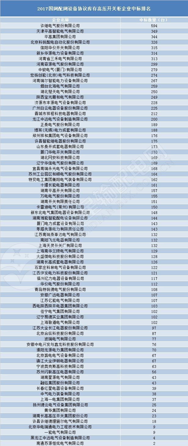 說到投標情況,怎么會沒有中標的情況呢?接下來,邊肖將讓大家了解2017年全國配電網設備協議庫存開關柜設備的中標情況。