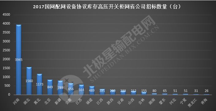 接下來,邊肖將帶您了解2017年配電網設備協議庫存高壓開關柜設備的國家電網省級公司的投標情況。具體投標數量見下圖。從圖中可以看出,河南的招標數量最多,有3945個單位。河南、湖北、河北北部、北京和新疆是招標數量最多的5個省,分別為3945、1560、1173、849和789個單位,占72.06%。此外,天津、山東、四川、重慶、上海、浙江、西藏和遼寧省四次未參加配網設備協議高儲存壓力開關柜設備的投標。