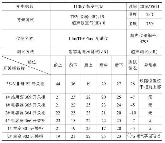 2016年5月11日,當(dāng)操作人員檢查一個(gè)110千伏變電站35kV的高壓室時(shí),他們聽到輕微的間歇放電噪音。通知維護(hù)人員后,測試人員趕到現(xiàn)場,使用了UltraTEVPlus+測試儀。對(duì)電壓為11+35千伏和0+的110千伏高壓室進(jìn)行了瞬態(tài)地電壓試驗(yàn)(TEV)和超聲波局部放電試驗(yàn)(兩種檢測方法的數(shù)據(jù)如下表所示)。