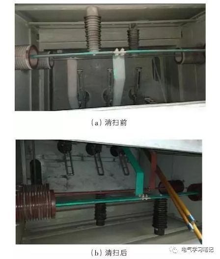 通過瞬態(tài)地電壓和超聲波兩種測試方法,對(duì)發(fā)現(xiàn)的缺陷進(jìn)行了處理。經(jīng)確認(rèn),110kv 變電站35kVⅱ母線PT開關(guān)柜上層母線倉積有嚴(yán)重污染。主要原因是前幾天的降雨導(dǎo)致母線排a相支柱絕緣子受潮,導(dǎo)致絕緣性能下降,從而導(dǎo)致局部放電故障的發(fā)生。